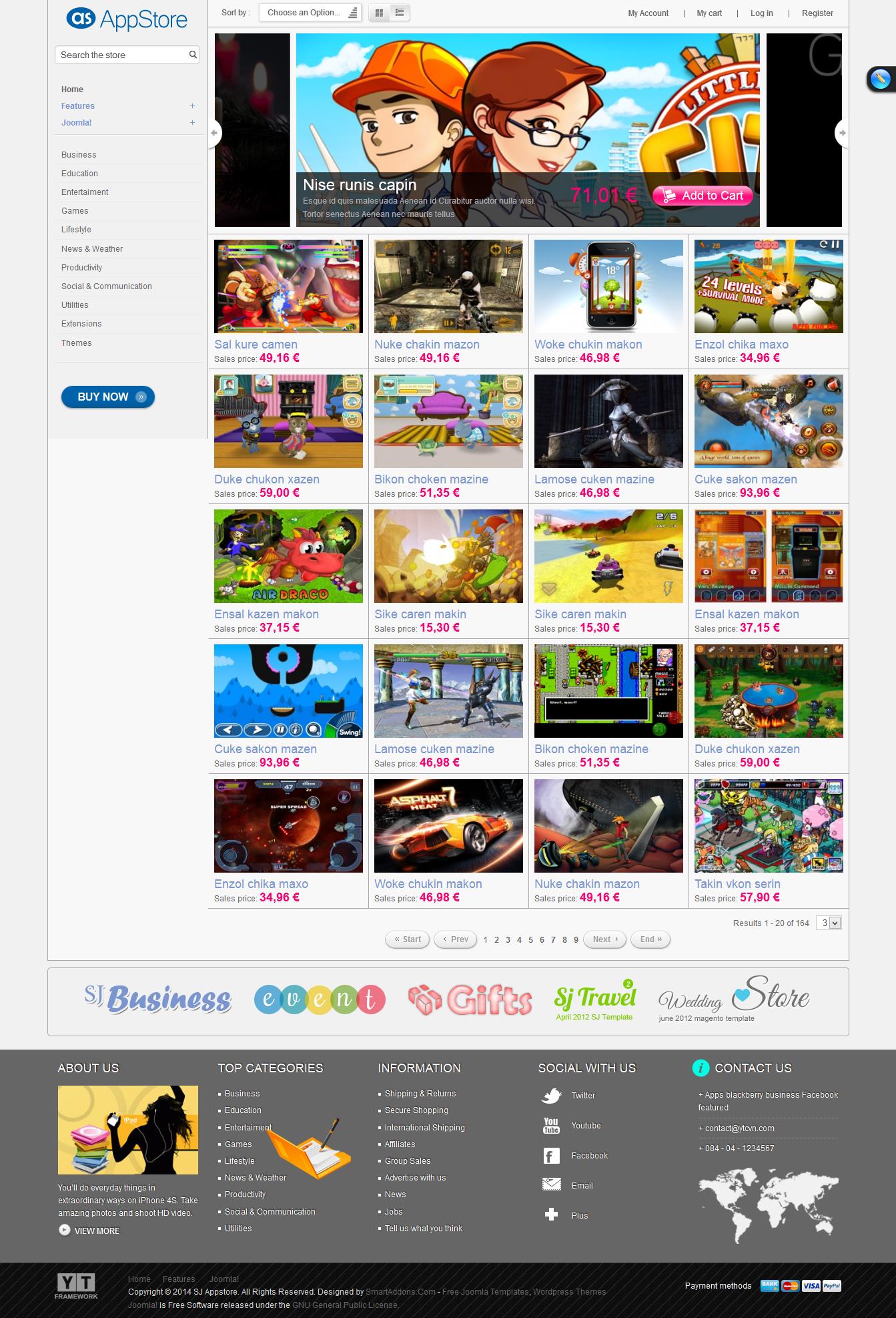 SJ AppStore - a new, high-quality template for Joomla 2.5x developers SmartAddons. This template is perfect for sale or just spreading the mobile applications. Virtuemart underlies the project, SJ Appstore well optimized and has four color themes. Content "loaded" during the scroll, well adapts to any browsers and portable devices. Easy navigation is complemented sliders posts and other extensions: Accordion Menu, Mega Menu module and Mini Cart Pro. SJ AppStore - a great choice for creating high-quality, functional online store on Joomla.