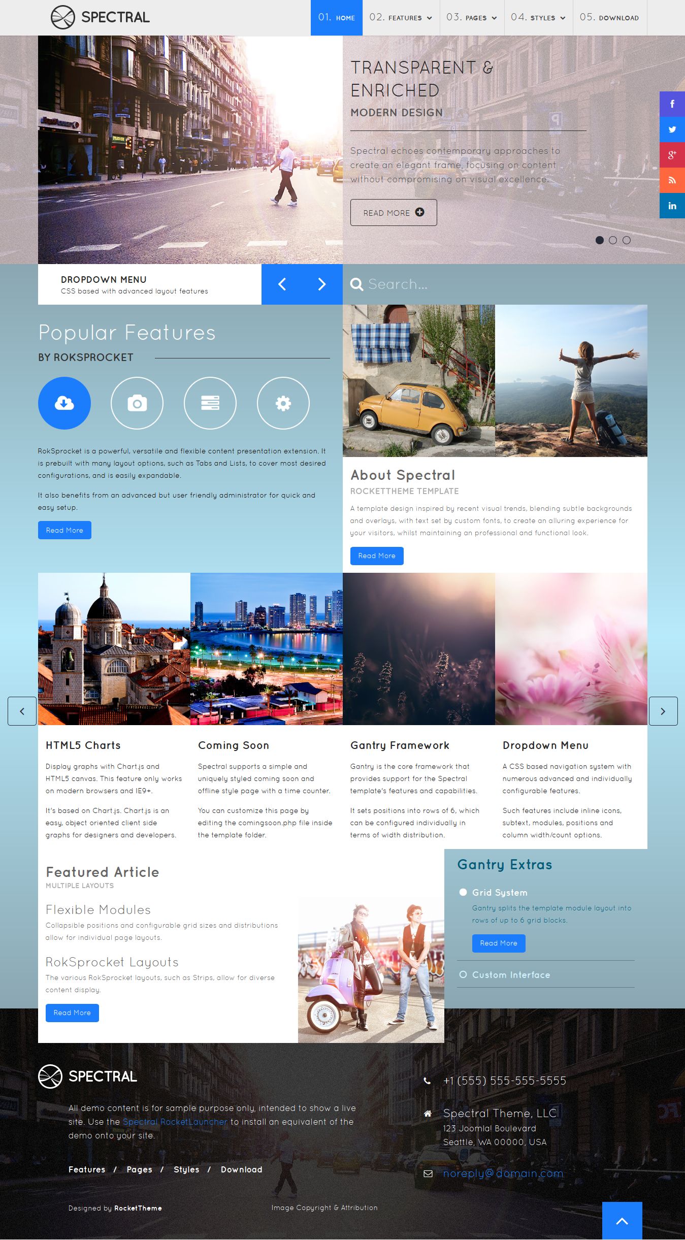 RT Spectral - it represented the developers of this popular design studio like Universal RocketTheme template for CMS Joomla versions 2.5x and 3.1x. The template has a modern design, which includes in appearance 8 variants, which are easily using the internal manager editing. Elegant style in the template is achieved by using the latest trends of web development. Layout has adaptive layout that supports any existing mobile platforms and correct, any screen display of a site. RT Spectral includes a 88 module positions. Excellent optimized downloading images has a sequence and more. There assembly club expansion.