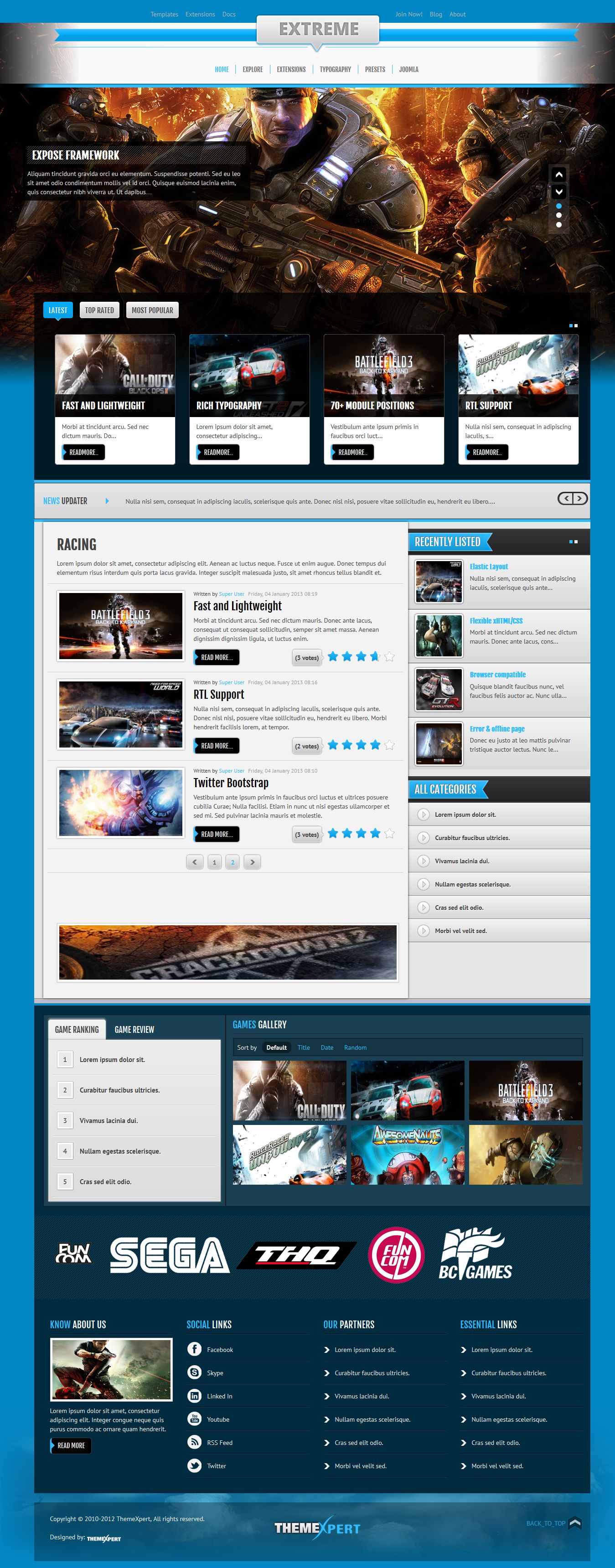 Computer games today are developing rapidly and successfully. Naturally, they attract more people. Do not therefore become popular gamer sites? Certainly so! Any addictive anything a person needs the support of others like it. So, if we decide to create such a portal, help a couple of templates to help implement your idea! TX Extreme from studio ThemeXpert - a pattern that is based on Joomla, you will help to create convenient for visitors to the site, a community for fans of the game. Supports five unique visual style, the latest programming languages: CSS3 and HTML5. Not be difficult to make it darker or lighter website, as well as install any picture as a background. TX Extreme Expose Framework developed and, just like all the previous patterns, has a flexible design.
